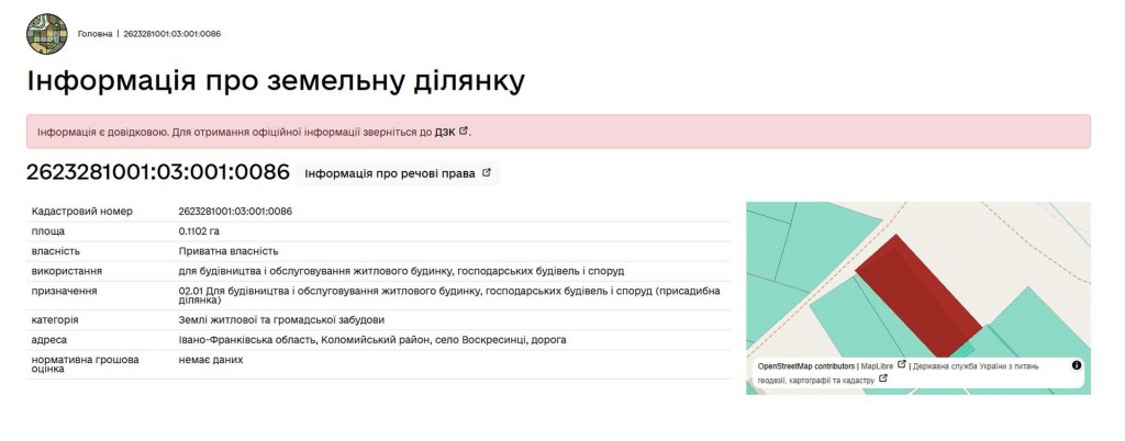 Площею - 0,1102 га, призначення - для будівництва житлового будинку.