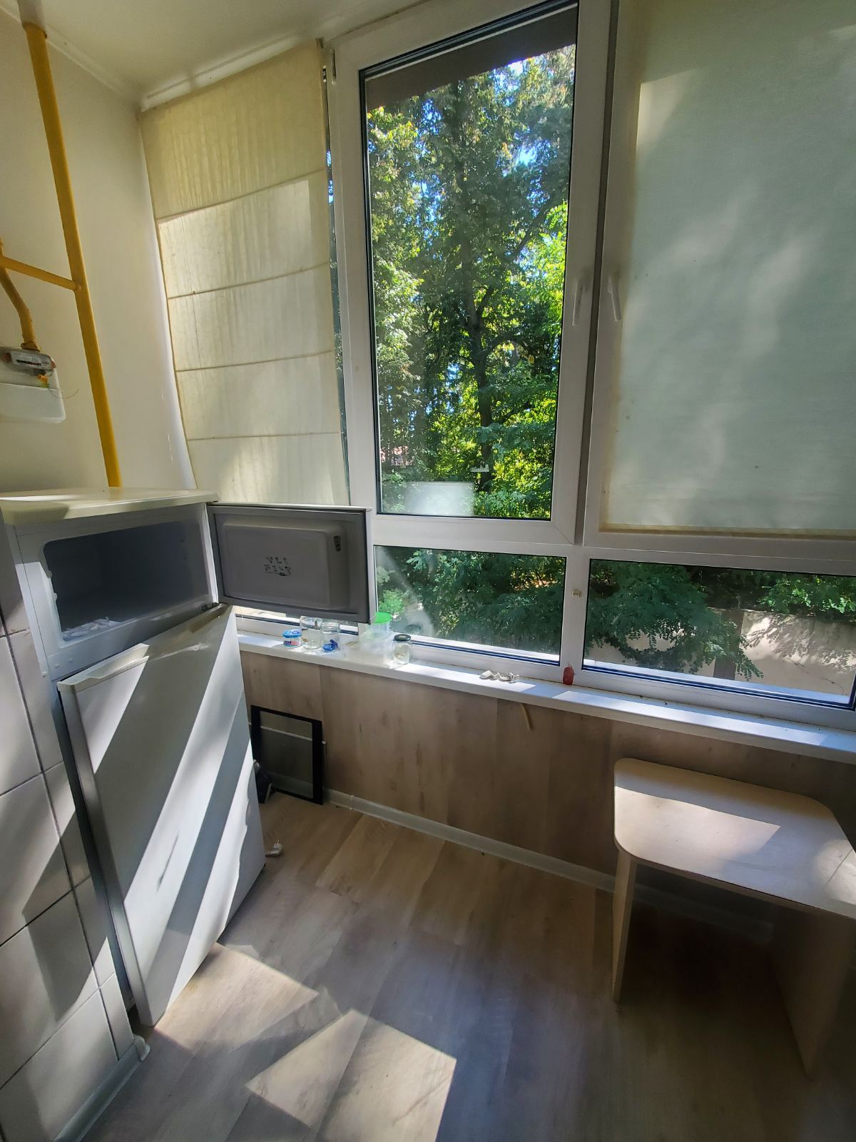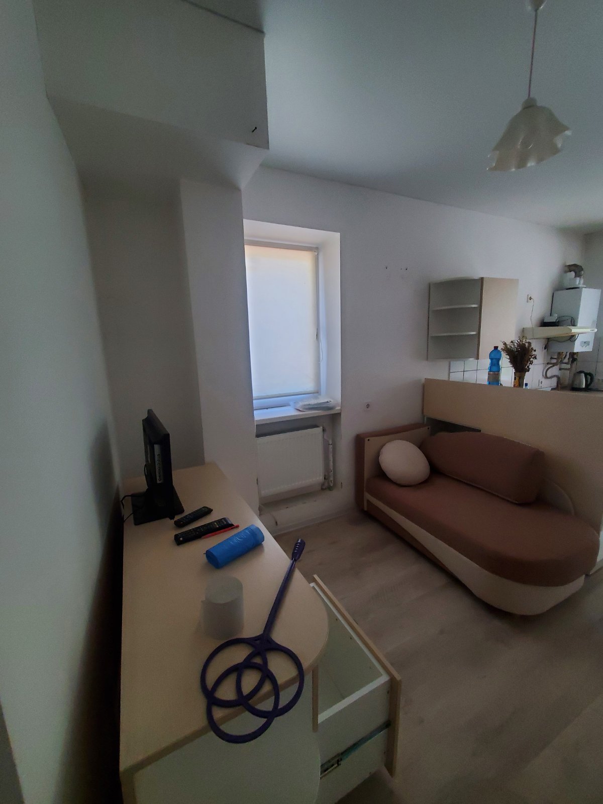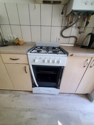 Кухня-студія з зоною спальні та окремим санвузлом. Комплектація меблів та техніки: диван розкладний, обідній стіл, шафа-купе, газова плита, холодильник, витяжка, мийка. Санвузол з ванною, пральна машина, умивальник з дзеркалом. Встановлений двоконтурний газовий котел на опалення, газовий лічильник. Велике панорамне вікно.