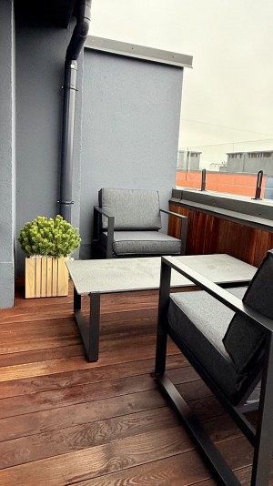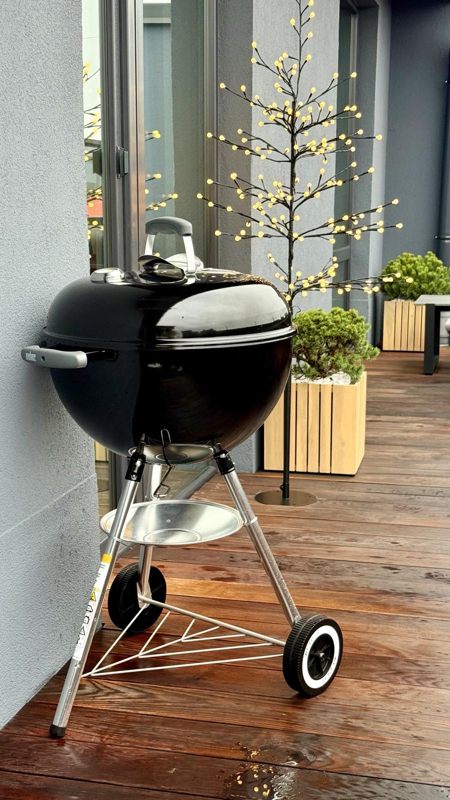 Велика тераса з садовими меблями, барбекю зоною, устелена палубною дошкою.
