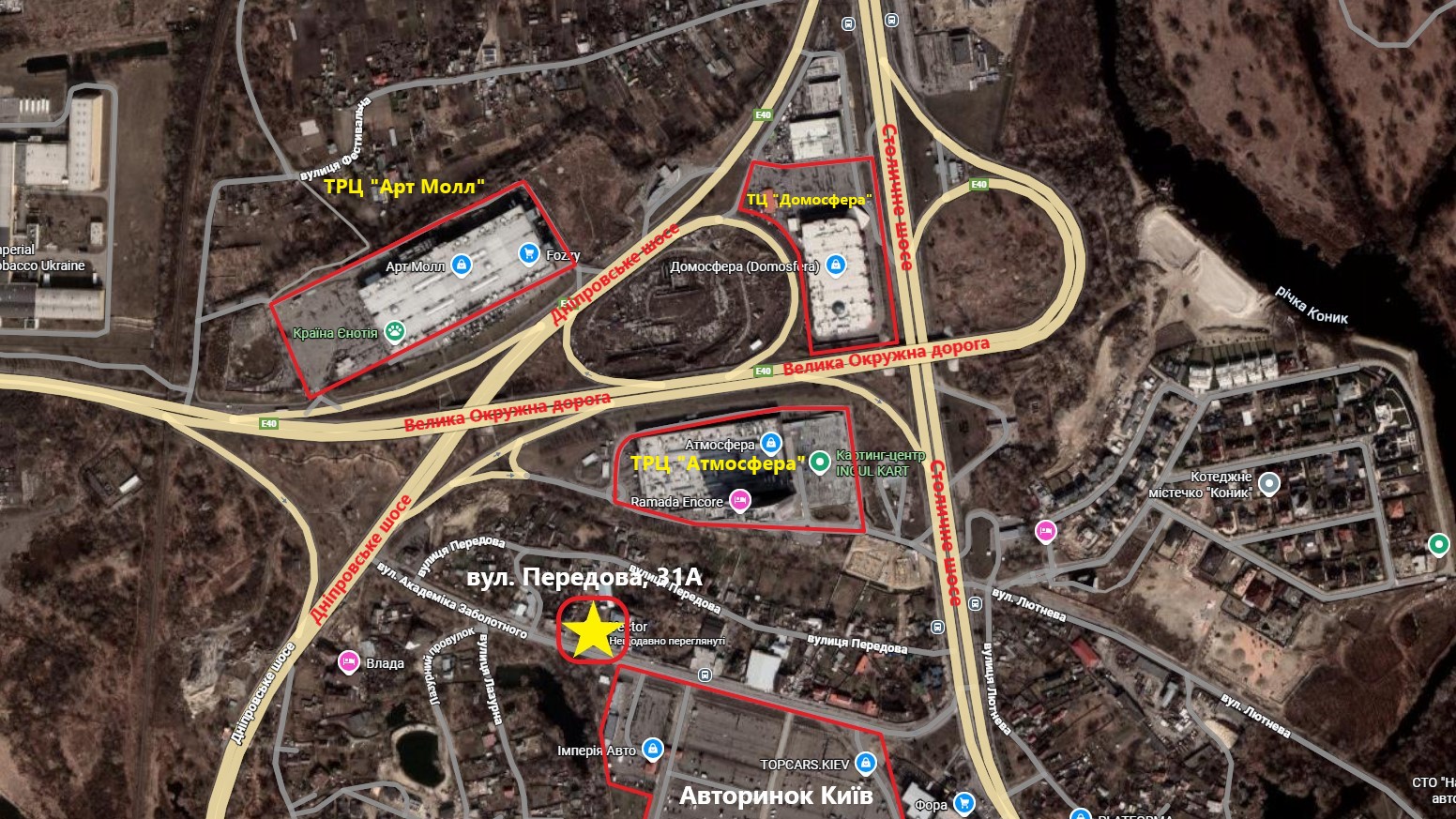 Навпроти приміщення Авторинок, активний трафік, асфальтована дорога. Зручний виїзд на Кільцеву та Столичне шоссе.