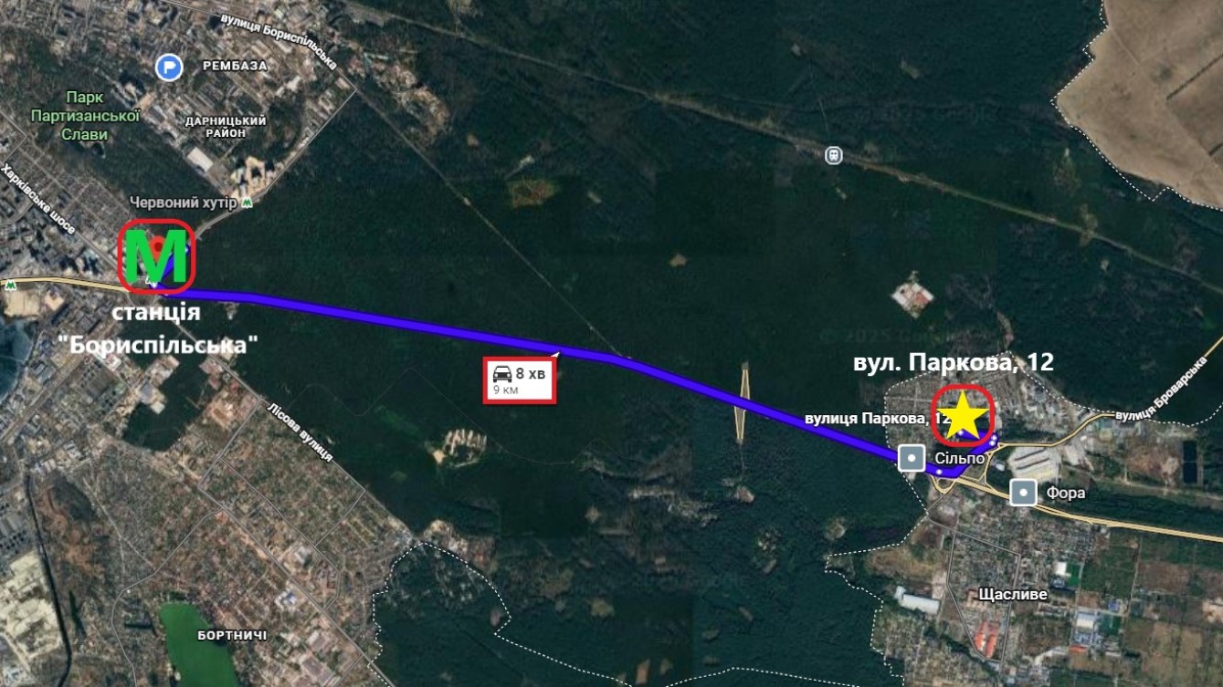 Зручно дістатися на метро Бориспільська, Позняки, Осокорки, Харківська, Лівобережна. Поруч зупинки різних маршруток 316, 317А , 318, 808 та ін. До метро Бориспольської- 8хв. на авто.