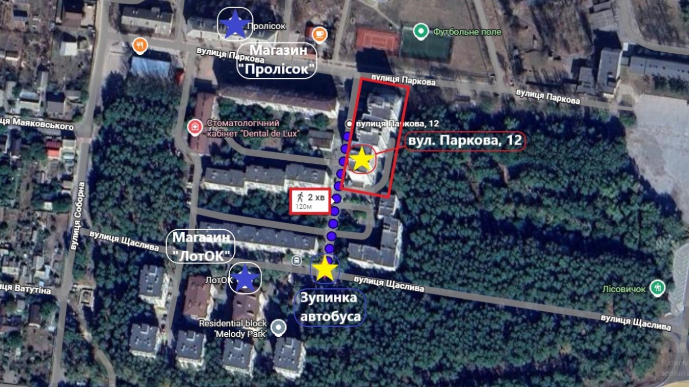 Гарний район в найближчому селищі під Києвом, навколо ліс і парк, розвинена інфраструктура. В пішій доступності дитячий садок, школа, магазини, аптека Подорожник, гіпермаркет Фоззі. Продуктовий маркет ЛотОК, BOX маркет, дитячий коворкінг. Тенісний корт, спортивна площадка.