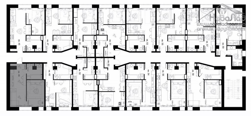 Вторая секция: Площадь квартир от 26,8 м2 до 35 м2, все квартиры квадратной формы, с большими окнами.