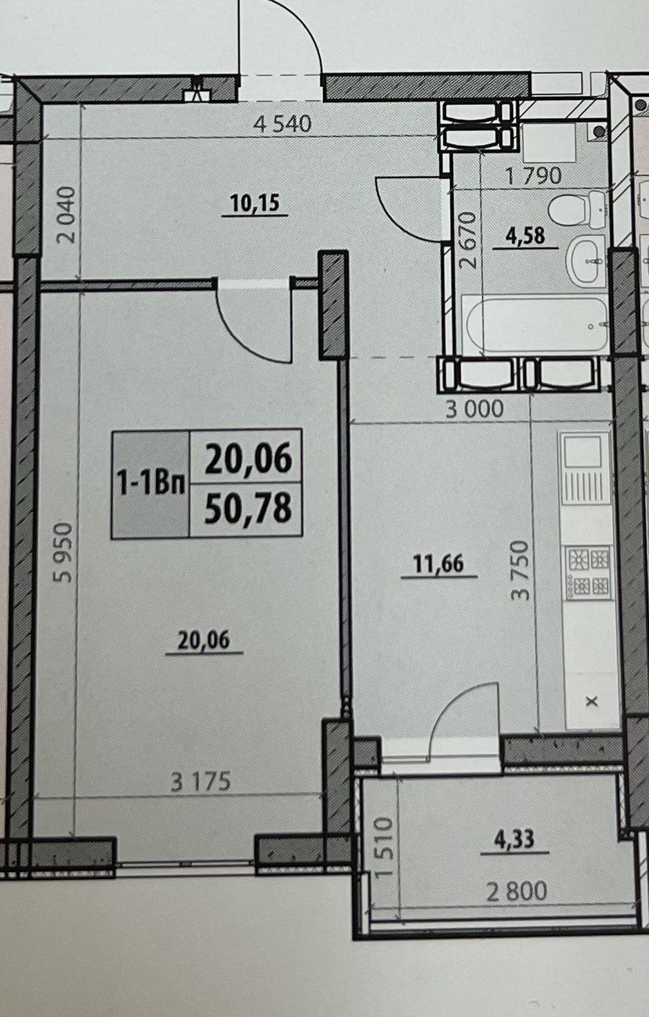 Общая площадь 49,4м2/20,06м2/11,66м2, сан узел 4,58м2,прихожая 10,15м2, балкон-лоджия 4,33м2.