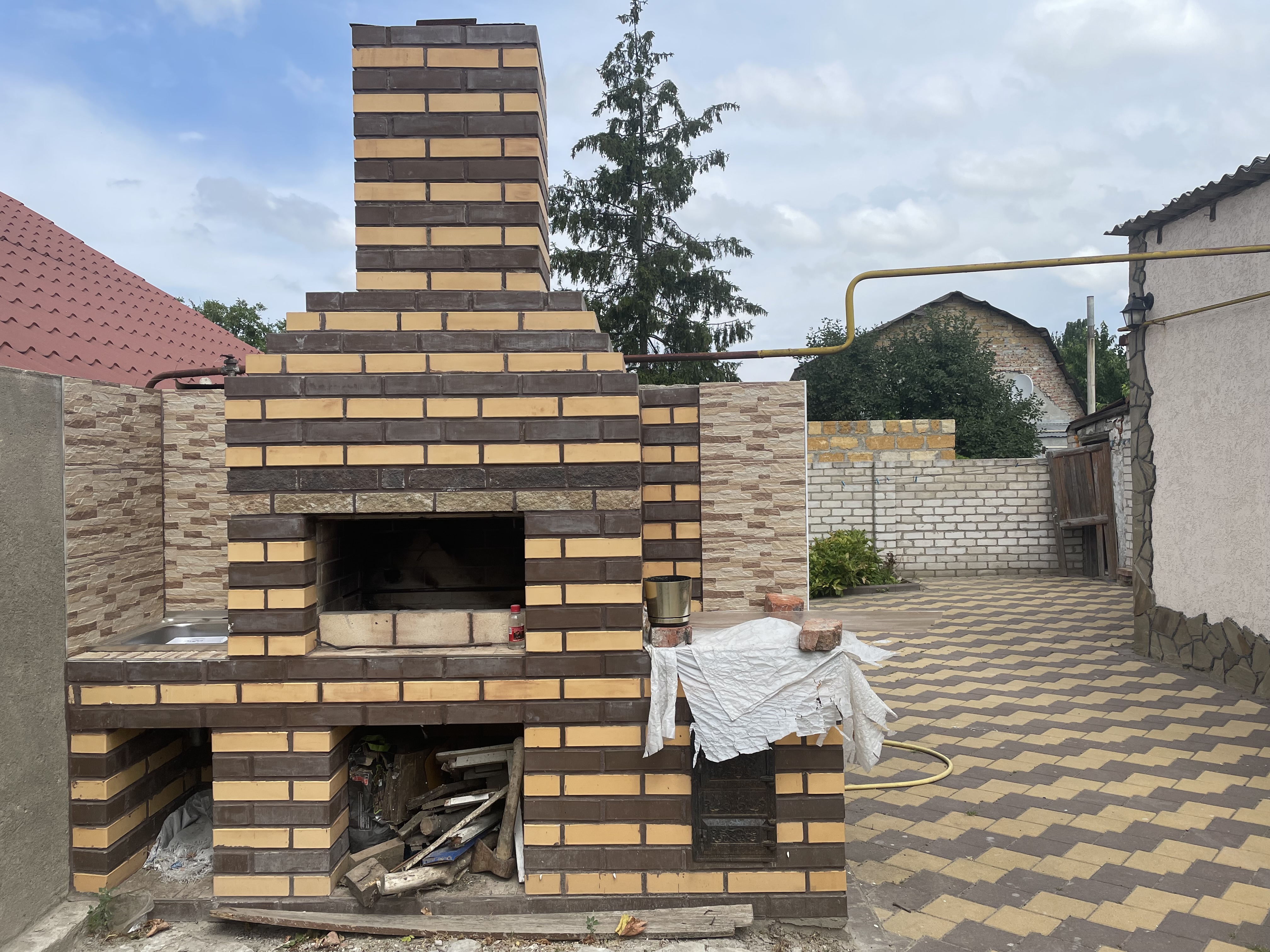 Красивый, ухоженный двор уложен плиткой. Есть зона барбекю, гараж с подвалом, хозпомещение.